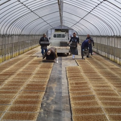 台車は10mほどの距離を運びます。また、3日後にはその台車を室(むろ)から出し、ハウスに苗箱を並べる作業も行います。