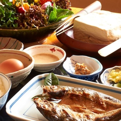 平飼いしている卵や、自家製無農薬野菜、壱岐の納豆など、健康的な朝ごはんです。(1食150円)