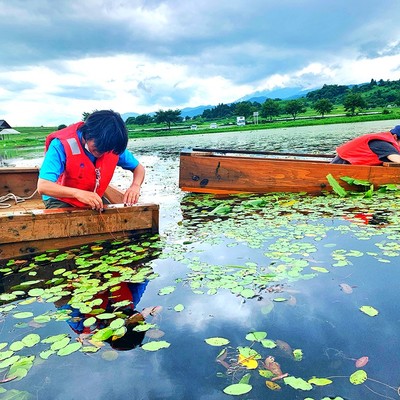 【天然ジュンサイ摘み採り】夏にしか体験できない、箱舟に乗って天然ジュンサイの摘み採り♪摘み採ったジュンサイはお持ち帰りいただけます。