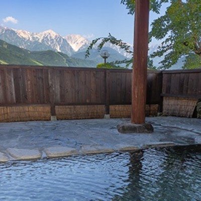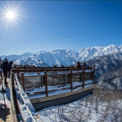 白馬マウンテンハーバー 。北アルプスの雄大な景色を望む絶景テラス。スキーの合間に立ち寄るのもおすすめです。