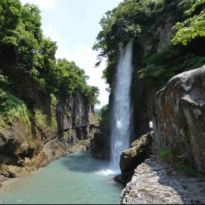 綿ヶ(わたが)滝。手取渓谷にある滝です。水飛沫が綿の舞っているように見えることから名付けられました。