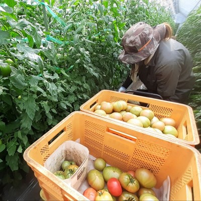 ・トマトの収穫、出荷作業(収獲コンテナの重さは20kg以上あります、今まで持てなかった人は居ませんが)