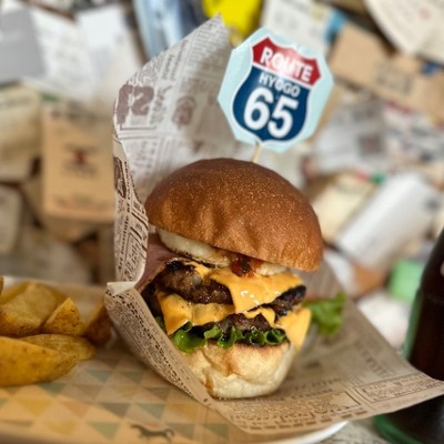 圃場から歩いていける距離にある「ROUTE65」🍔自家製バンズにガツンとくるジューシーなハンバーグ!THE アメリカンスタイル!🇺🇸ハンバーガーやピザの味も抜群に加え、マスターのこだわり切った店内も必見!美味しいデザートもあります🍮バイカーは特に足を運んで欲しいです🏍️超オススメ!!