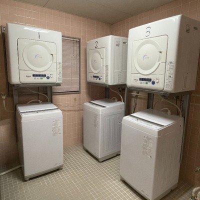 写真は女性用寮の共用ランドリー(洗濯機)です。男女共有寮にも同等機能でございます。