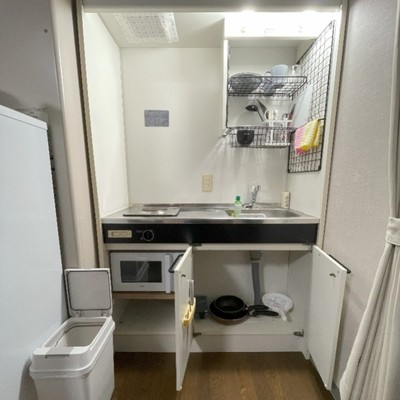 写真は女性用寮のお部屋のキッチンとなります。男女共有寮にも同等機能でございます。