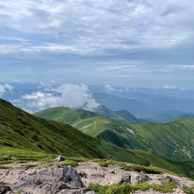 れ標高1984mの月山!夏にはスキーが滑ます。山開きは7月からです。