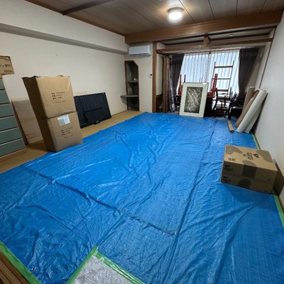 15畳の元々客室だったお部屋です。現在物置として利用をしておりますがご利用の際にはブルーシートは外し・荷物も横に寄せる予定ですのでご安心ください。