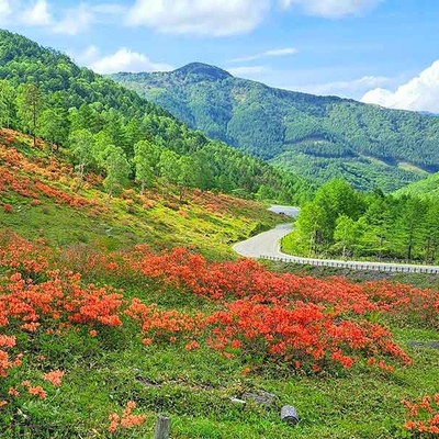 湯の丸高原のレンゲツツジ群落(車で7分):毎年6月下旬、つつじ平に咲く約60万株のレンゲツツジ大群落は、国の天然記念物に指定されています。山一面を朱色に染めるレンゲツツジを眺めながら、気軽に散策できます。