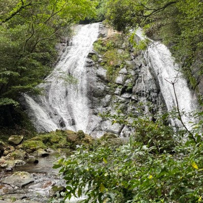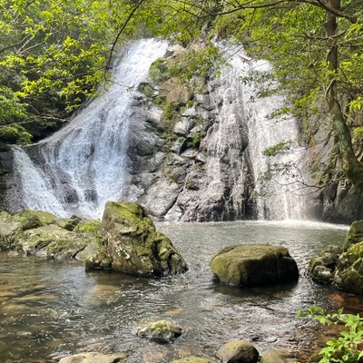 夫婦のように寄り添って流れ落ちる篠原夫婦滝。木陰も多く避暑地として知られています。