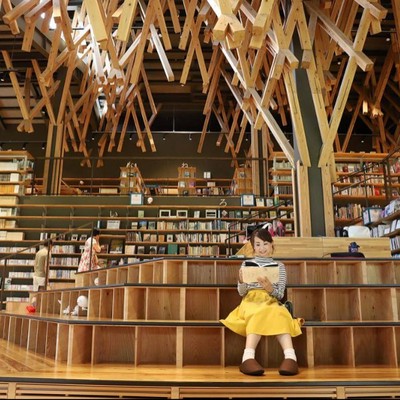 雲の上の図書館:車で20分。建築家・隈研吾氏が設計した木造づくりの近未来的な建造物。館内には約5万冊の本が並び、ゆっくりとくつろげるソファー席やカウンター席などで思い思いのときが過ごせる。奥にはカフェコーナーもあります。