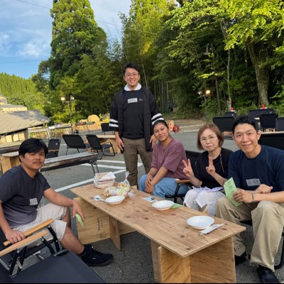 写真は黒川温泉の一大福利厚生イベント「スタッフビアガーデン」での一枚です。奥の法被を着ているのが社長です。一緒に湯本荘をそして黒川温泉を盛り上げましょう!