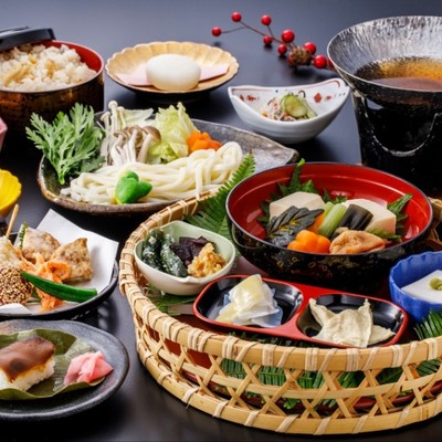 (高野山名物の精進料理のほか、高野山麓のお米を使用したお米ヌードル、熊野牛のすき焼きなどを提供)
