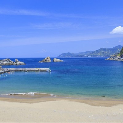 雲見海水浴場:海蝕崖や豪壮な荒磯の続く日本有数の景勝地で、晴れた日には正面に富士山を臨むことのできる絶景の海水浴場。透明度があり、スキューバーダイビングのスポットとしても有名です。