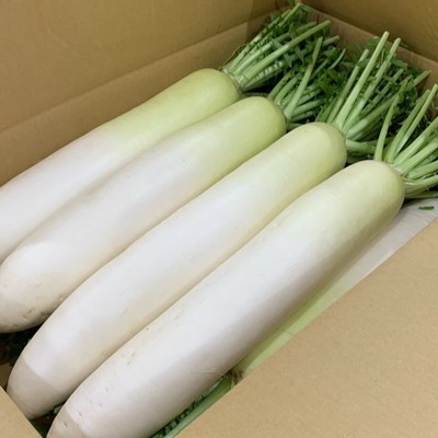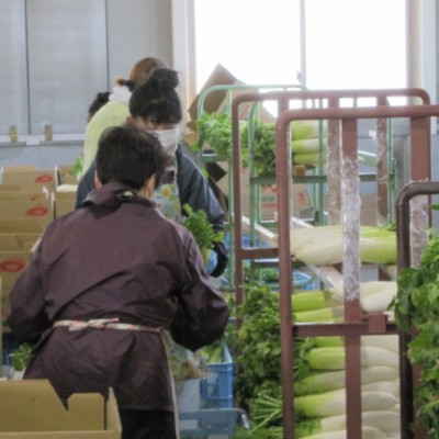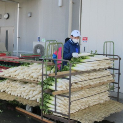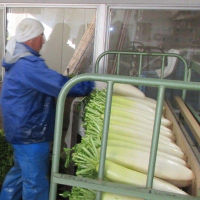 ・洗い終わっただいこんをサイズ別に仕分ける作業。