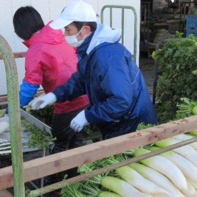 ・畑のだいこんを収穫、トラックへ積込み、作業場へ搬入する作業。