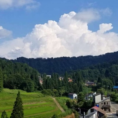 宿の周辺風景です(夏に撮影)真っ青な夏空に山々の緑が映えます。
