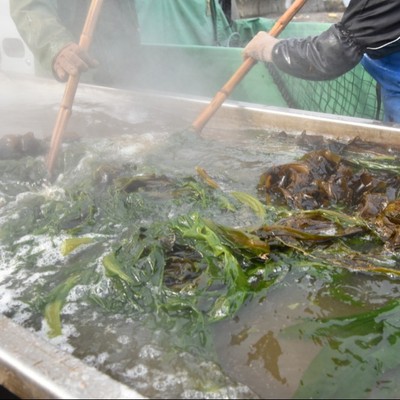 ①わかめの湯通し作業と塩蔵作業と片付け。