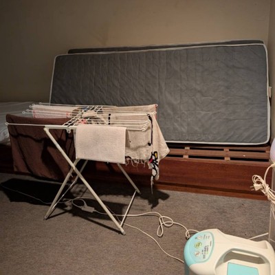 スタッフ部屋(未使用時の写真のためマットレスが立て掛けてあります)。ランドリーラック、タオル掛けも設置してあります。