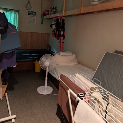築20年程。6畳程の和室ですが、畳の上に絨毯敷で綺麗なお部屋です。寝床以外の風呂、トイレ、キッチン、リビングは共用となります。寝床からトイレまでは廊下なのでプライベート時間はあまり動線が被らないです。内装は綺麗なので前年度は家についてのクレームはありませんでした。気になる事があれば、ご質問下さい!