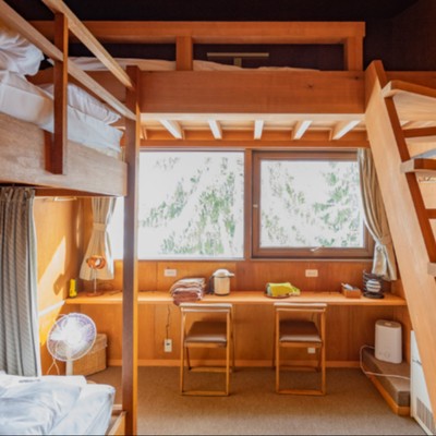 スタッフ部屋です。1~3人になる場合あり。縦列にベッド+マットレスが2つ、奥の小上がりにもマットレスを乗せて使用できます。