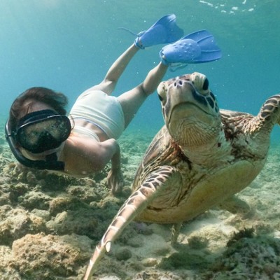 ホテルの目の前のヤドリ浜では、ウミガメと一緒に泳げるチャンスも!?奄美大島ならではのきれいなサンゴや魚たちを見て楽しめます!