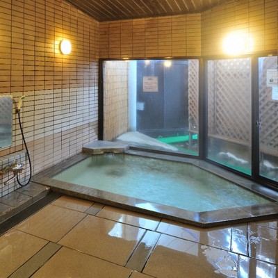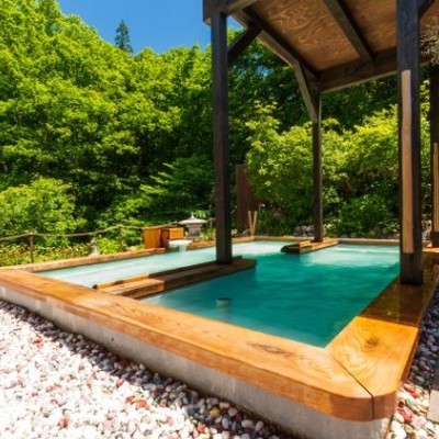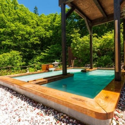 【100%掛け流し源泉「庭園風呂」】大浴場の内湯に隣接しております。この湯船が蔵王温泉で、一番最初に造られた露天風呂です。名の通り庭園を眺めながら入浴できる開放感にあふれたお風呂です。お仕事で疲れた体をぜひ癒してください。
