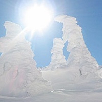 【樹氷】冬季蔵王の風物詩の樹氷。この樹氷を色彩豊かな照明でライトアップし、蔵王ロープウェイの夜間飛行で観賞しに行こうという「樹氷ライトアップ」などの催しもあります。
