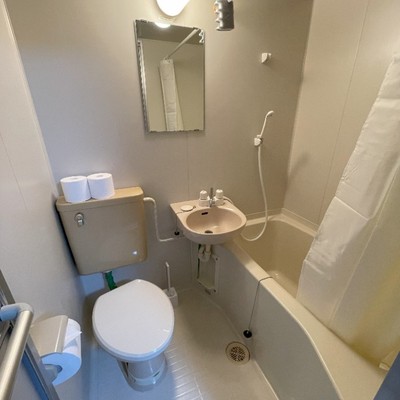 写真は女性用寮①のお部屋内のユニットバスとなります。男女共有寮にも同等機能でございます。