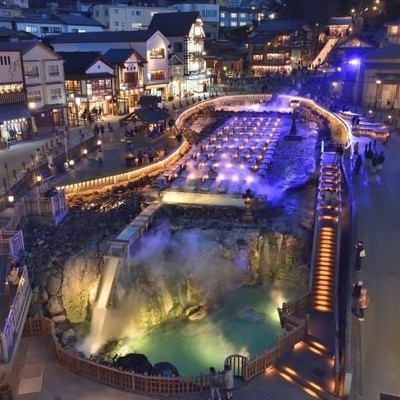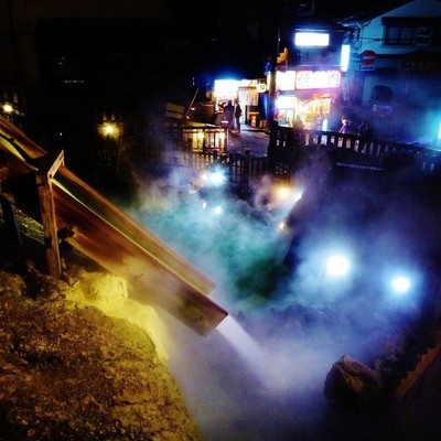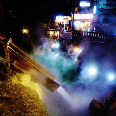 湯畑の夜のライトアップは心落ち着く絶景です。