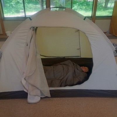 キャンプ場施設内にテントを張って過ごしていただきます(屋内)。