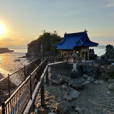 当園から車で5分程の所にある水島は、万葉集に「尊い水の島」と歌われ、日本書紀によると、ここを訪れた景行天皇が食事をする際に小左(おひだり)という者が天地の神に祈ったところ、水が涌き出たとされ、昭和30年頃までは水が出ていました。万葉の里公園が整備されており、近くに長田王による水島の歌の碑が建てられています。平成21年(2009)に国指定名勝に指定された、夕日と干潟が素晴らしい場所です。