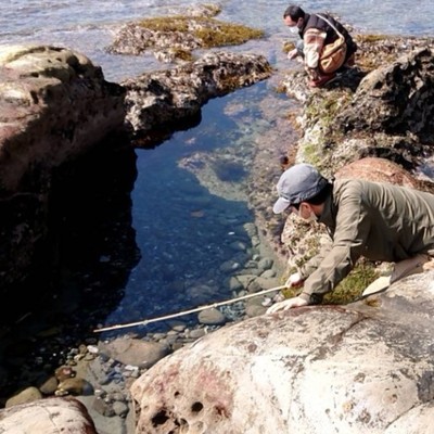 海岸で貝殻拾いや磯遊び、釣りも楽しめます。画像は馬の尻尾の毛で魚釣りしているところ。