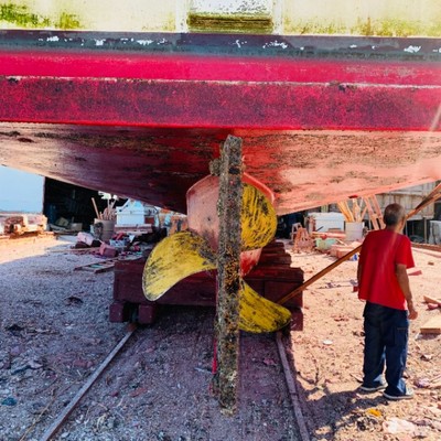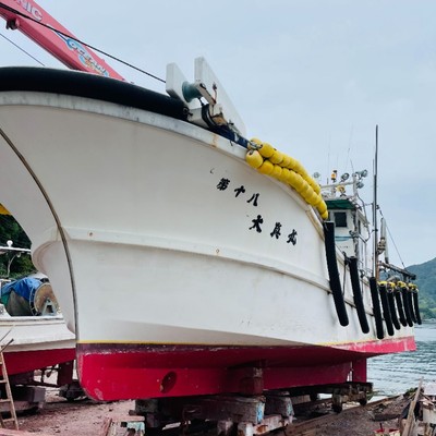 船をドック場に上げて、船底を掃除します。乾いたらペンキを塗っていく作業です。