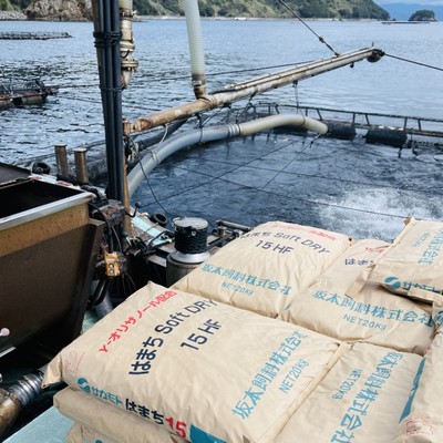 海上での作業になります。餌の入った袋を機械に入れていく作業です。