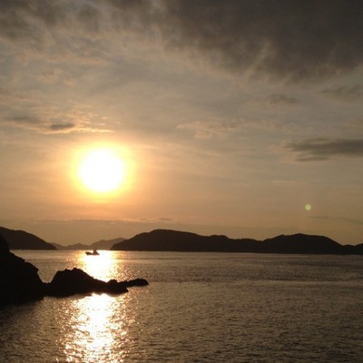 『自然が美しい!』海から見る朝焼けや夕日、外灯のないなかの星空など、美しい自然の風景を楽しむことができます。写真は沖に沈む夕日と漁船。運が良ければイルカの群れやマンタに出会えることも。