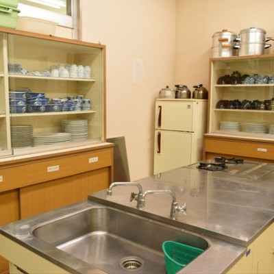 調理室。朝夜のみ利用可能。食器や調理器具はありますが、調味料はありません。