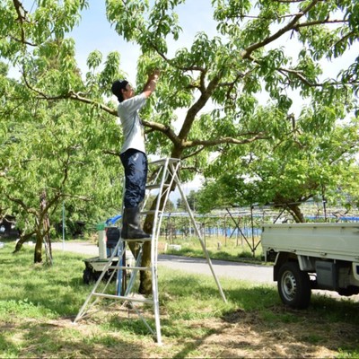 桃の摘果作業をお願いします。果実の数を調整することで、大きくておいしい桃を育てます。
