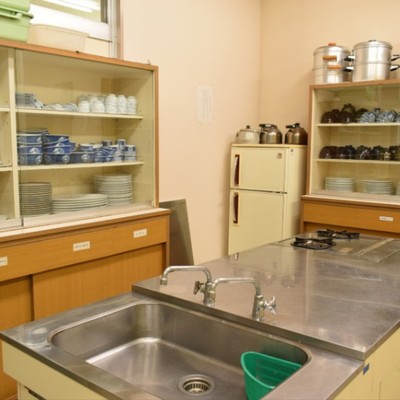 調理室。朝夜のみ利用可能。食器や調理器具はありますが、調味料はありません。