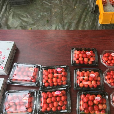 収穫したさくらんぼに傷がないか確認し、丁寧にパックに詰めていく作業です。
