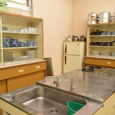 調理室。朝夜のみ利用可能。食器や調理器具はありますが、調味料はありません。