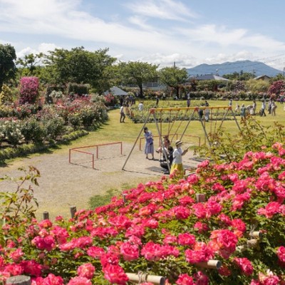 【一本木公園(バラ公園)】県内でも有数の種類と株数を誇るバラ園として有名です。園内には、バラ(850種3000株)のほかにも桜やさまざまな宿根草など、四季折々に楽しむことができる花々が咲き誇ります。また、明治中期の洋風建築である中野小学校旧校舎が移築され、信州中野銅石版画ミュージアムや一本木公園展示館が併設されており、年間を通して楽しむことができます。(宿泊場所から徒歩で約20分、車で約5分)