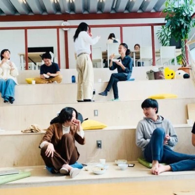 宿泊先の小高パイオニアヴィレッジは3.11に伴う原発事故の被害により一度は人口がゼロになった街で、新たな地域づくりに挑む人々が集まる、宿泊機能のついたコワーキングスペースです。 ひな壇を中心にテーブル、スタンディングデスク、ロングデスクが囲み、多様なスタイルで働くことができます。 建築デザインとそこでの活動が評価され、2019年にはグッドデザイン賞を受賞しています。