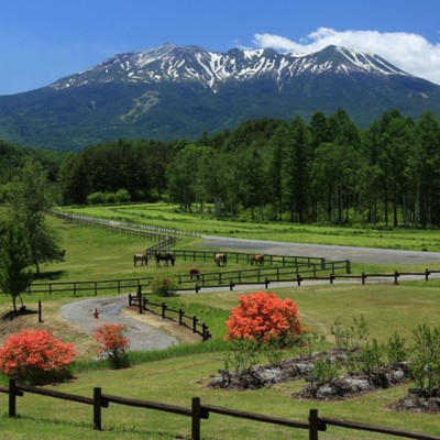 バスで30分。木曽開田高原「木曽馬の里」から望む御嶽山。