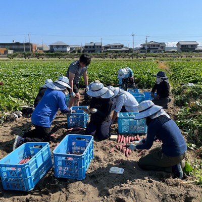 ・畑の端の芋を人力で堀り上げ、規格ごとにコンテナ等で分別の上、トラックへ積込み、倉庫へ搬入する作業。