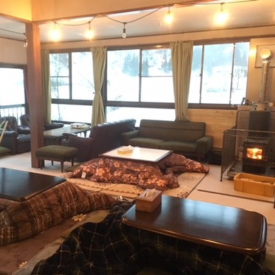 1階リビング。コタツと薪ストーブあります。