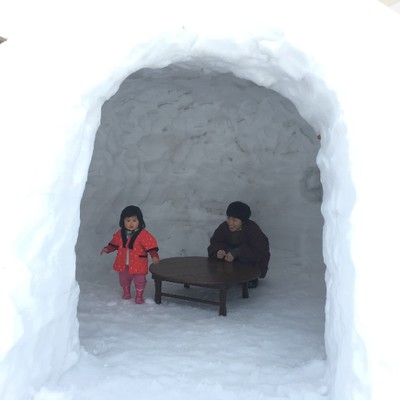 せっかく雪国に来たなら「巨大カマクラ」作りたいという元気のある方は、スコップ貸すのでレッツトライ。既に積んである雪に穴を掘っていくので、写真ぐらいの穴なら、3~4時間もあれば掘れると思います。