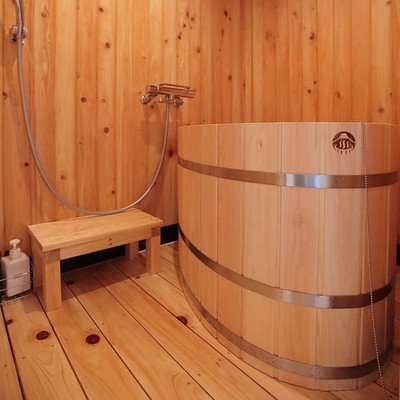 HOJO MACHI HOSTELのヒノキの樽風呂に入浴できます。