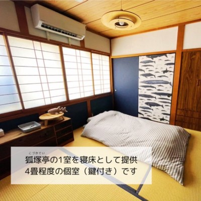 4畳程度の個室(鍵付き)でお風呂やトイレ/キッチン等は宿泊者共用です。