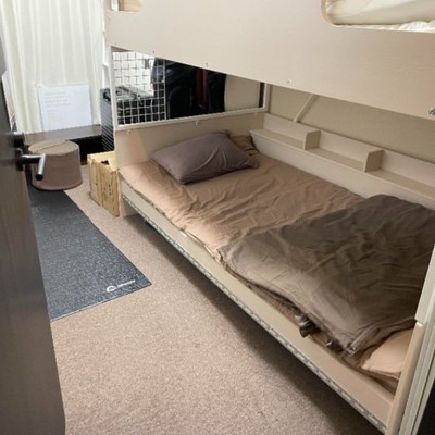 宿の枕や布団の予備や備品なども一部おいているスタッフルームになります。二段ベッドになります。個室です。廊下は共用スペースの近くのため、音はしますが、基本的に夜中12時~朝7時くらいまではゲストも寝ている方がほとんどです。