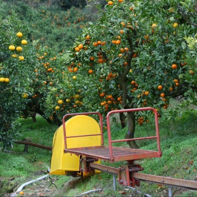 かごがいっぱいになったら、みかんを大きなコンテナに移し替えます。このコンテナ(約15~20kg)を、急な斜面や段差のある農園内の道を通って集荷場まで運びます。TOP画像のように傾斜があったり足元に注意が必要です。原則2人1組での作業ですが、場合によっては1人で運ぶこともあります。